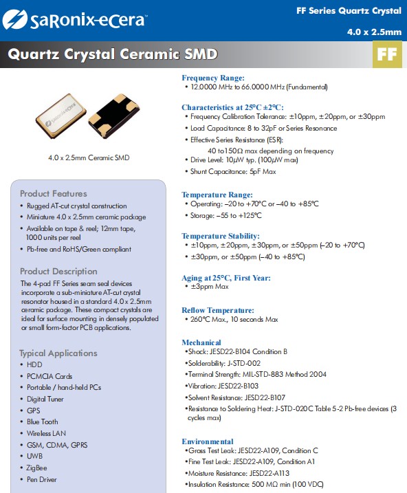 Diodes晶振,FF四腳貼片晶振,4025mm晶振,平板電腦晶振,FF系列接縫密封裝置適用于封裝在標(biāo)準(zhǔn)4.0x2.5mm四腳貼片晶振,外殼中的亞微型AT-cut晶體諧振器 陶瓷封裝。這些緊湊型晶體非常適合在密集彈出或小尺寸PCB應(yīng)用中進(jìn)行表面貼裝。堅(jiān)固的AT切割水晶結(jié)構(gòu) 微型4.0x2.5mm毫米陶瓷封裝 提供磁帶和卷軸;12毫米膠帶,每卷1000個(gè),無鉛且符合RoHS/Green標(biāo)準(zhǔn) 。典型應(yīng)用:硬盤驅(qū)動(dòng)器 PCMCIA卡 便攜式/手持電腦 數(shù)字調(diào)諧器 全球定位系統(tǒng) 碧藍(lán)之牙 無線局域網(wǎng) GSM、CDMA、GPRS 超寬帶 ZigBee 筆驅(qū)動(dòng)程序.