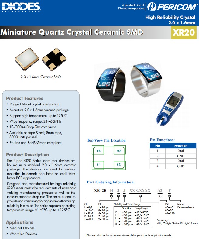 Diodes百利通晶振,XR20無(wú)源晶振,XR20H3J26.0000A2F晶振,醫(yī)療設(shè)備晶振,四腳貼片晶振XR20系列接縫密封裝置采用標(biāo)準(zhǔn)的2.0x1.6mm陶瓷封裝。這些器件非常適合密集或小尺寸PCB應(yīng)用中的表面貼裝。為高可靠性而設(shè)計(jì)和制造, XR20系列符合超聲波焊接制造工藝以及行業(yè)標(biāo)準(zhǔn)跌落測(cè)試的要求。該系列是為必須具有高可靠性的應(yīng)用提供精確計(jì)時(shí)的理想選擇。XR20系列無(wú)源晶振支持-40℃至+125℃的工作溫度范圍。堅(jiān)固的AT切割水晶結(jié)構(gòu) 微型2.0x1.6mm毫米陶瓷封裝 支持高達(dá)125攝氏度的高溫 寬頻率范圍:24~66MHz,符合JIS-C0044跌落測(cè)試,提供磁帶和卷軸;8毫米膠帶, 每卷3000個(gè),無(wú)鉛且符合RoHS/Green標(biāo)準(zhǔn),應(yīng)用于醫(yī)療設(shè)備,可穿戴設(shè)備。